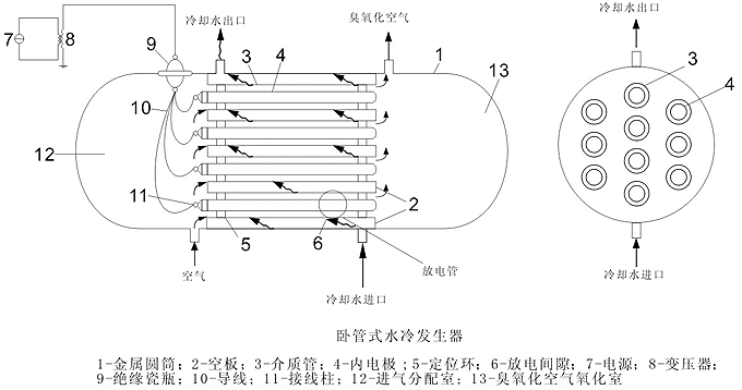 放電室內(nèi)冷卻水直接對介質(zhì)管(外電極)進行冷卻,將放電過程中產(chǎn)生的熱量及時散出,進入的干冷空氣對內(nèi)電極進行冷卻,使介質(zhì)管溫度保持穩(wěn)定.不易擊穿,使產(chǎn)量穩(wěn)定。